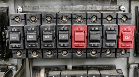 Row of old electrical circuit breakers in a fuse box, showing multiple black units in the off position and two prominent red units, one of which is engaged in the on position