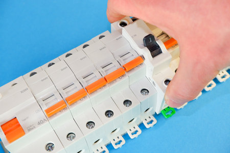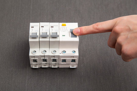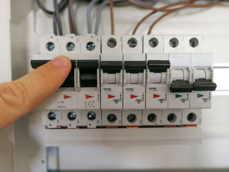 A person turns off an automatic electrical switch to disconnect the current circuit. Fire safety in electrical circuits. Close-up
