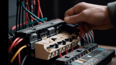 Detail close up of Electrician installing electric cable wires and fuse switch box with multimeter in hands. Generative AI Technology