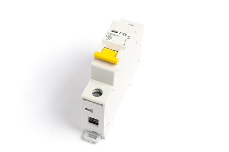 Two-pole electric circuit breaker modular design lies on the table on the background of a residential building. The switch is illuminated by sunlight. Protection and safety in residential buildings.