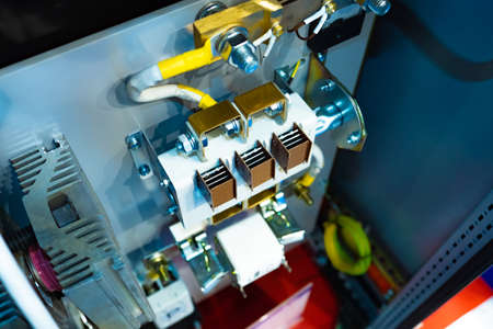 Fragment of electrical or network equipment. The interior of the electrical equipment. The insides of electrical equipment with wires and fasteners. Electronics repair concept.