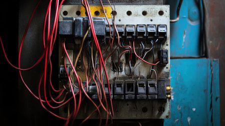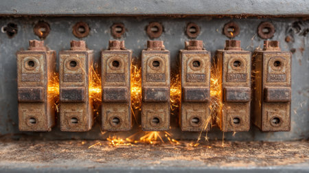 A close-up image of a rusty electrical circuit box featuring damaged switches and sparks, perfect for highlighting industrial safety and maintenance themes.