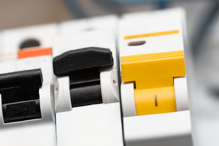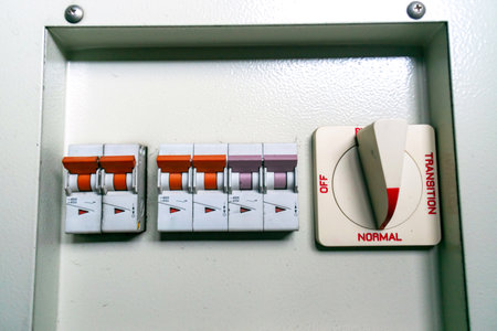 Automatic electricity switch circuit breaker control center box selective focus close up detail shot