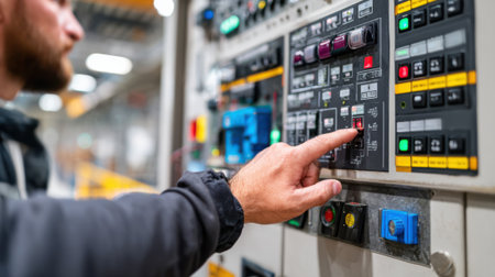 Operator adjusting variable speed control on industrial machine panel to optimize production efficiency in manufacturing environment.