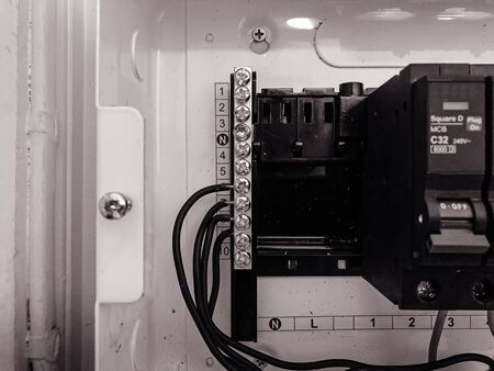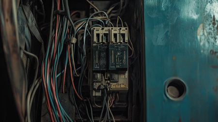 Close-Up of a Circuit Breaker Box with Color-Coded Wires. Concept of Electrical Wiring, Energy Management, Industrial Technology, Mechanical Engineering.