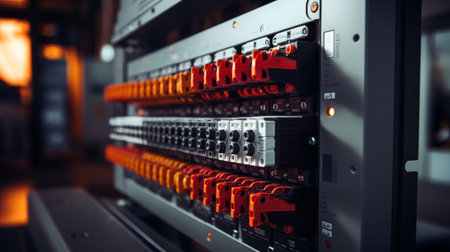 Macro view of switchgear equipment with illuminated indicators and warning signs
