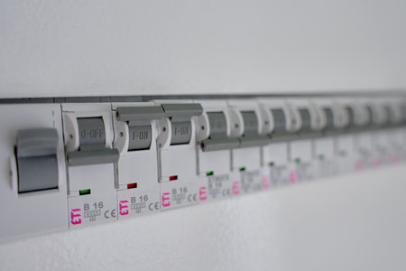 Power distribution board with row of circuit breakers and switches. Electrical panel with fuse box. Concept of home electricity safety, power distribution and electrical maintenance
