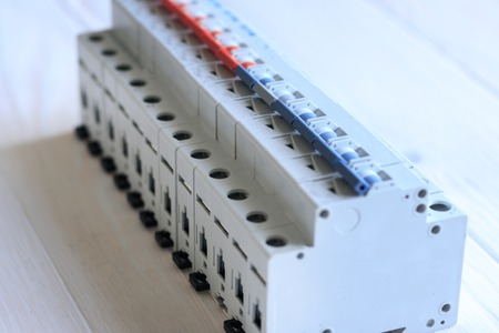 wooden background. on it in a row are automatic switches for opening the electric circuit