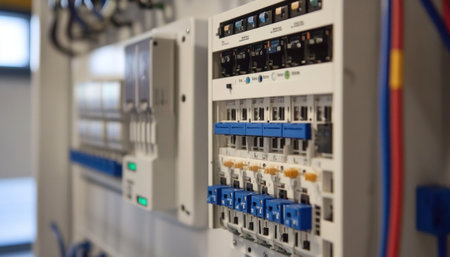 Close up of an electrical panel featuring circuit breakers, ensuring efficient power distribution within a building