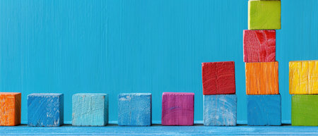 Colorful wooden blocks arranged on a table against a blue background, depicting concept of growth, structure, or early learning.