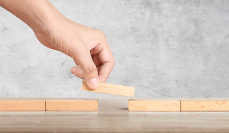 Hand liken person stepping up wood block stacking as step stair, business idea