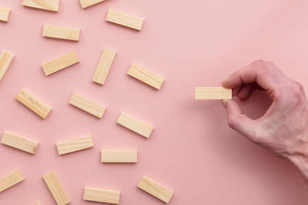 Concept of building success foundation. Men hand put wooden blocks on the stack of wooden blocks.