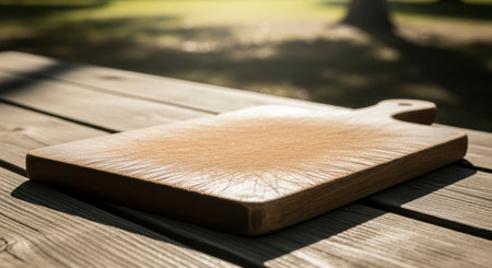 An empty, well used wooden cutting board rests on a rustic outdoor picnic table under natural sunlight. The board shows signs of use, suggesting a history of food preparation in an outdoor setting.