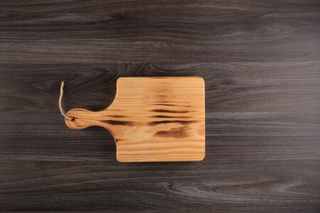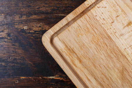 wooden cutting board on a dark brown wooden background. place for text.