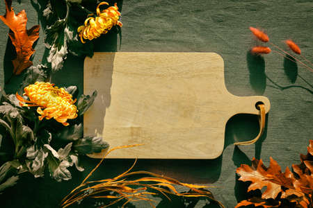 Cutting Board over a towel on a wooden kitchen table. The view from the top. space for copying text