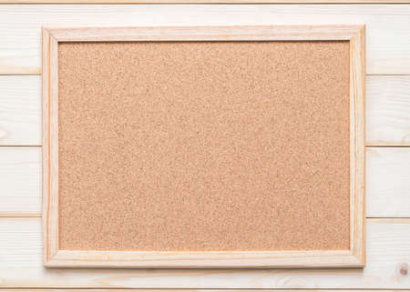 Blank cork board with corkboard texture background with wooden frame hanging on white wood wall for bullentin, memo or noticeboard announcement