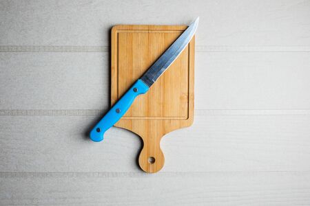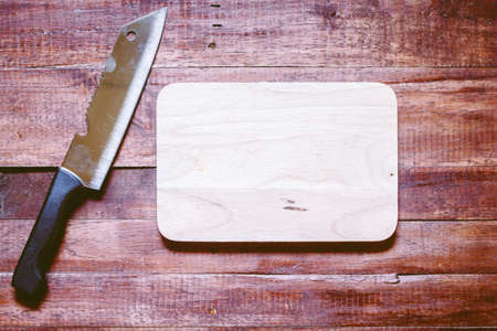 Wooden cutting board and knife on wooden table. Top view.