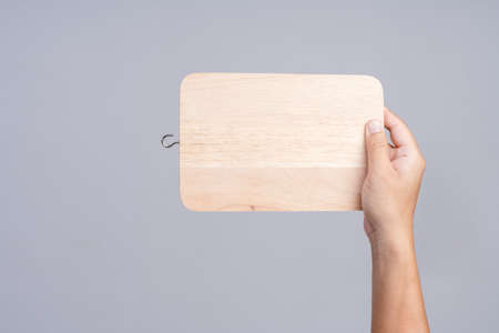 Hand holding wooden cutting board for kitchen on white background