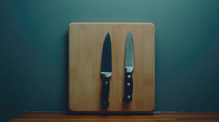A pair of sharp kitchen knives resting on a wooden cutting board. Ideal for culinary arts, food preparation, and modern kitchen aesthetics.