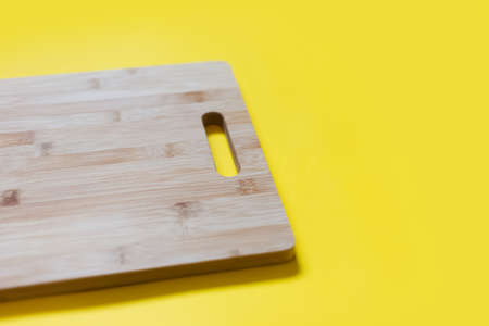 Wooden board with knife on yellow background