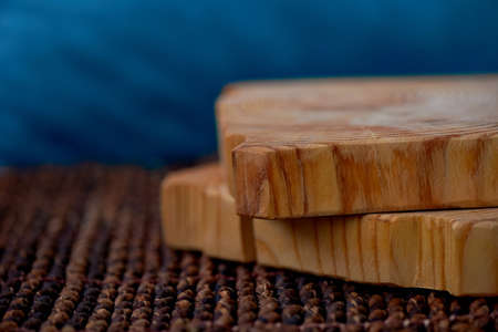 Wood cutting board on wooden background with copy space