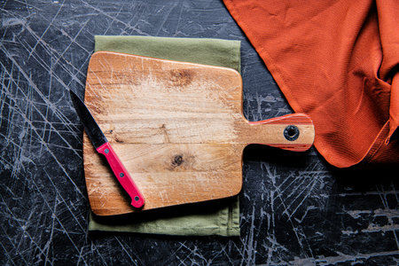 Cutting board with vegetable knife in retro style on dark background. Dark background. Wood texture, abstract wooden background. Cooking background. Wood texture, abstract wooden background.