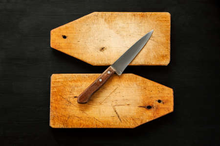 Two empty wooden cutting boards with knife on a dark background, top view