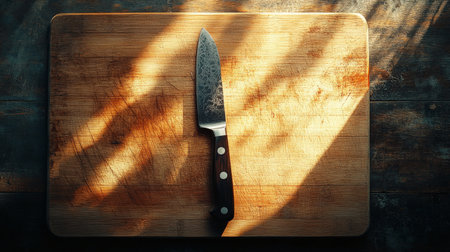 A kitchen knife with a brown wood handle is on a wooden cutting board. Clear details and vibrant colors enhan...