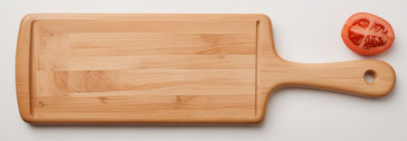 top view of wooden cutting board and tomato on white background, panoramic shot