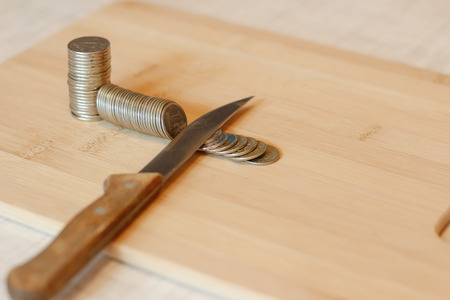Knife cutting a pile of coin. Concept of budget cuts, savings, recession. The division into parts. Taxes. Interest rate.