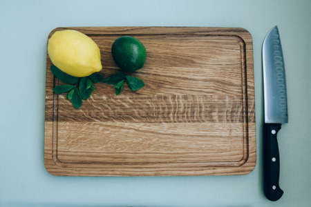 Yellow lemon and green lime, mint leaves on a wooden board. A large knife next to a cutting board. Tropical fruits on light brown wooden background. Fresh citrus. Free space for text. Top view