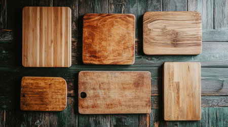 A stunning collection of wooden cutting boards displayed on a rustic background. Each board showcases natural grain patterns, ideal for cooking and serving.