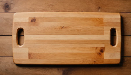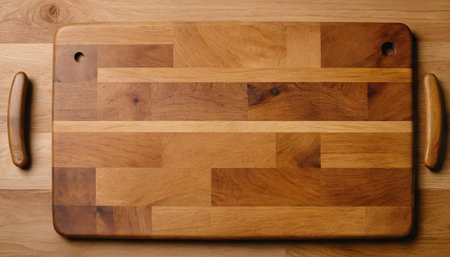 A beautifully crafted wooden cutting board with a smooth finish and practical handles, perfect for any kitchen. Ideal for prepping ingredients.