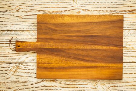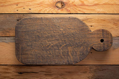 Empty vintage cutting board on planks food background concept