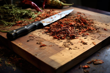 A Fresh herbs on wooden cutting board with knife, perfect for cooking