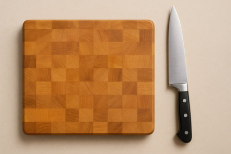 End grain wooden cutting board and sharp stainless steel kitchen knife lying on beige worktop, preparing for cooking