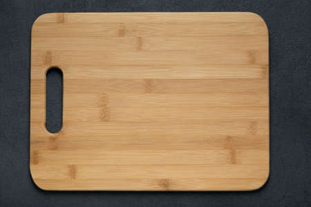 Wooden cutting board on dark background, top view, copy space