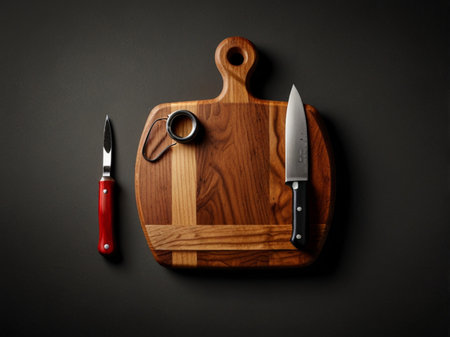 knife and cutting board on a dark table