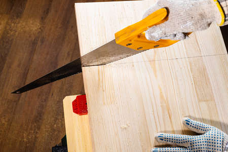 above view of sawing wooden board with hand saw on workbench at home