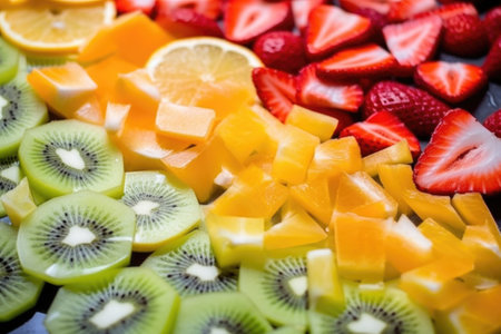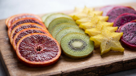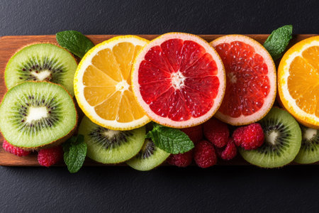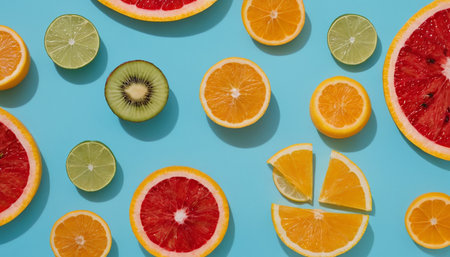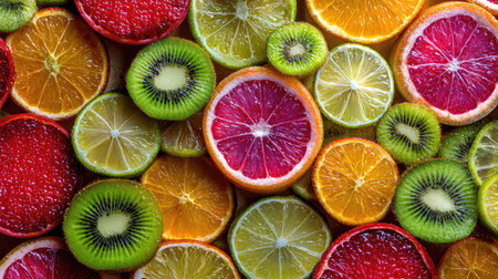 A visually stunning arrangement of various fruit slices including citrus and kiwi, showcasing their vibrant colors and textures, ideal for culinary use or health-themed projects.