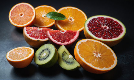 A variety of citrus fruits, including oranges, grapefruits, and kiwis, are arranged on a dark surface