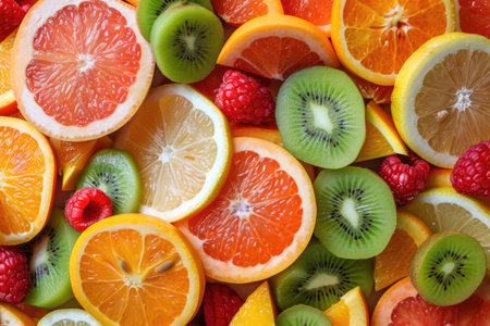 A close-up of an assortment of fresh fruits, including sliced oranges, kiwis, raspberries, and blueberries, showcasing vibrant colors and healthy natural produce.