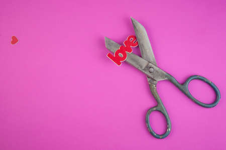Old scissors with word love. concept of divorce. top view