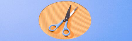 panoramic shot of metal scissors on orange circle