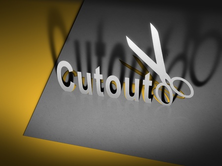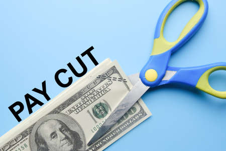 A picture of scissors and fake money with the word pay cut.