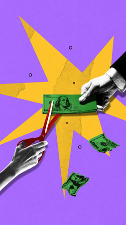 Hand with scissors slices dollar stack in businessmans hand. Cutting Value. Conceptual collage.