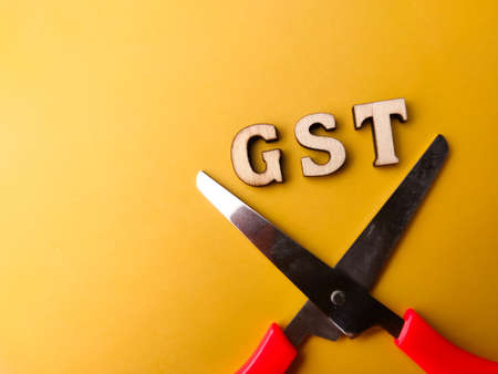 Scissors and wooden word with text GST on a yellow background.