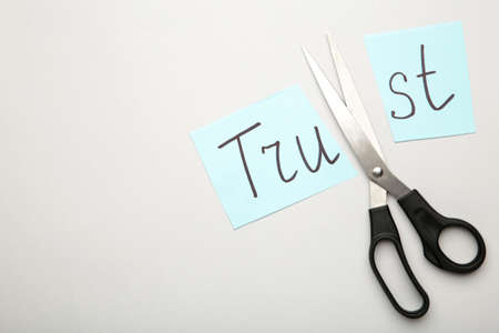 Scissors cutting paper with word TRUST on gray background. Concept of jealousy. Top view
