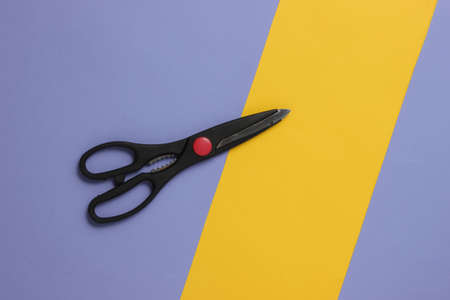 Kitchen scissors on a colored paper background. Top view