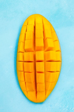 Fresh mango organic fruit on blue background. Top view. Close up.